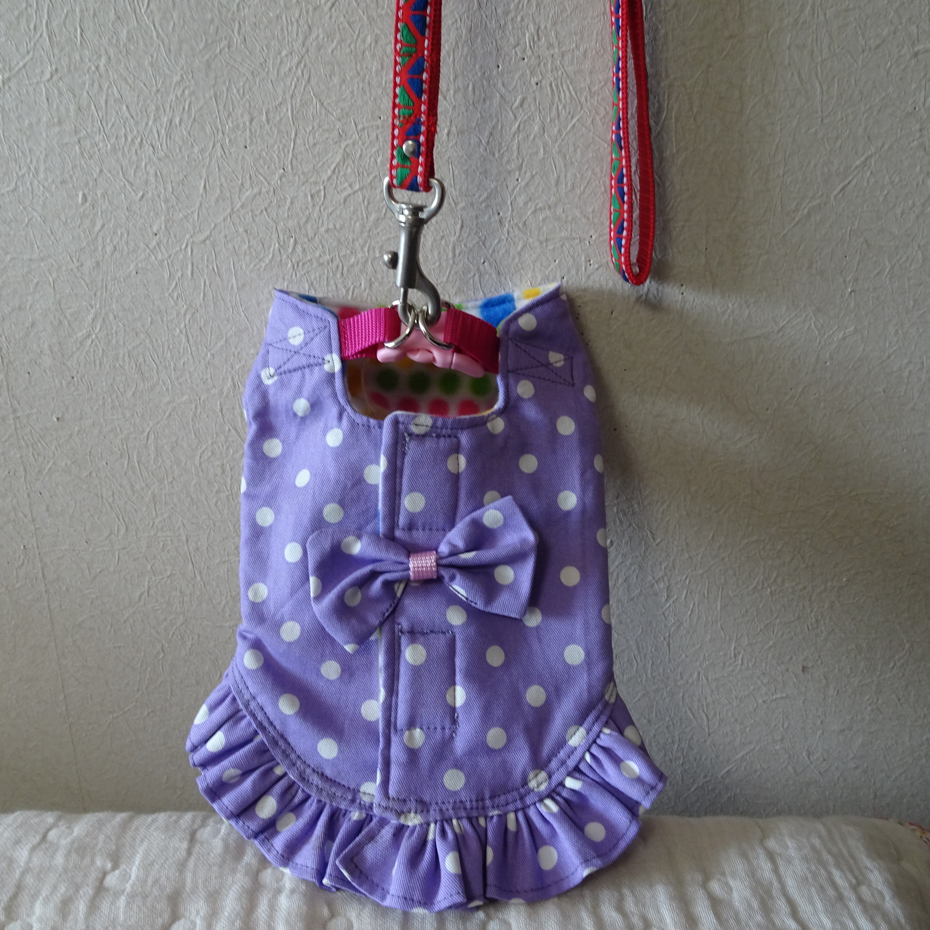 前足を通して、背中で留めるだけの簡単装着の可愛いスカート付ハーネス服です。