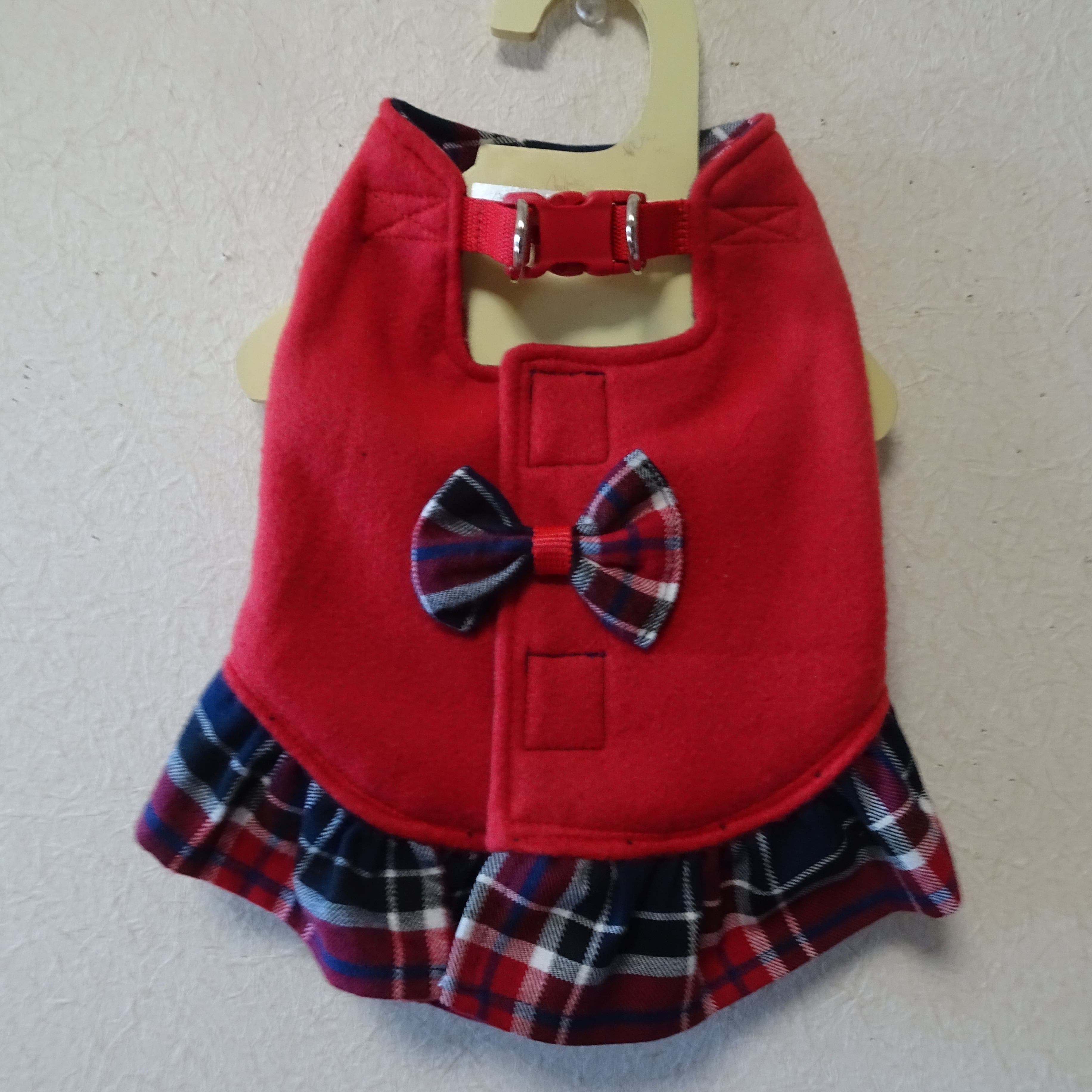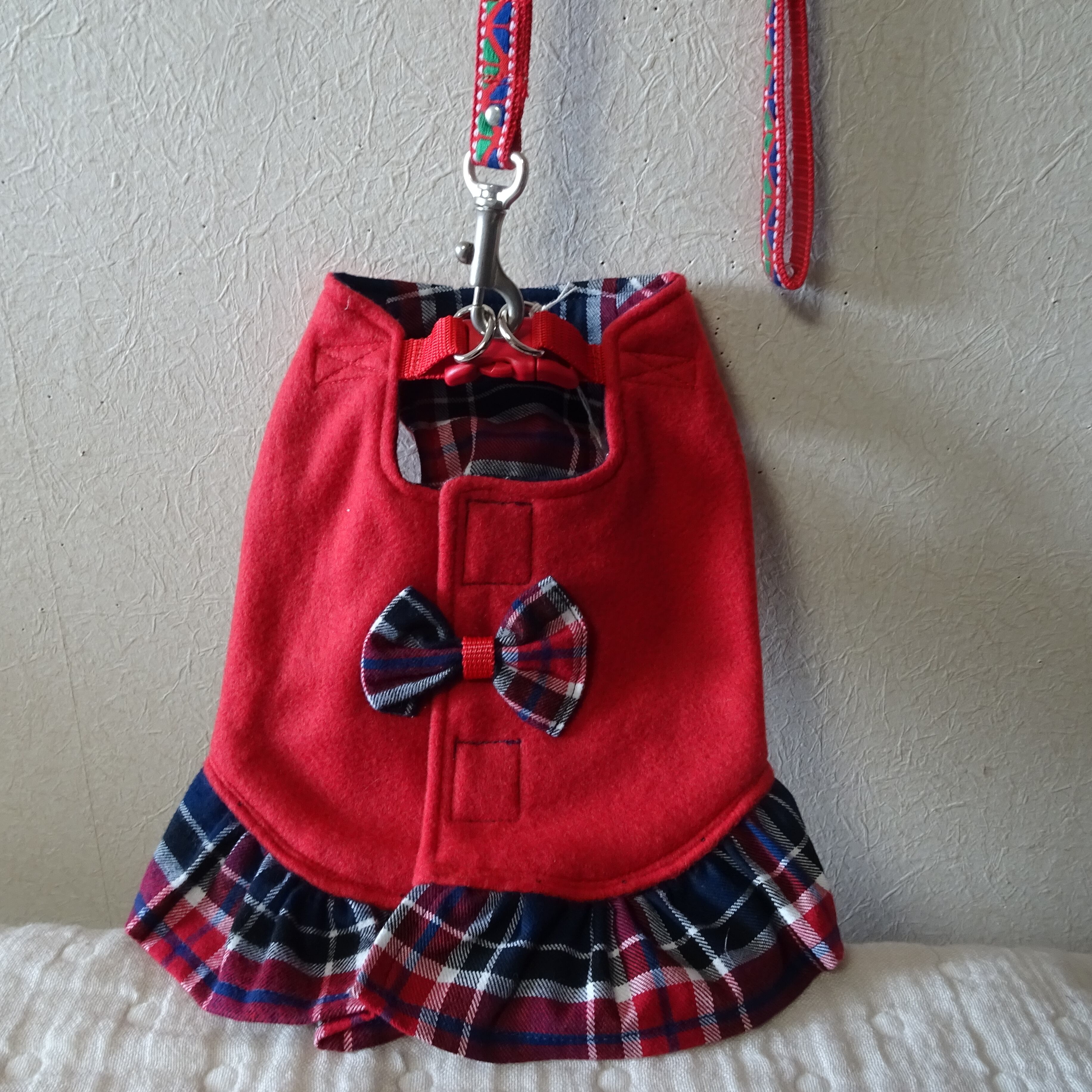 前足を通して、背中で留めるだけの簡単装着の可愛いスカート付ハーネス服です。