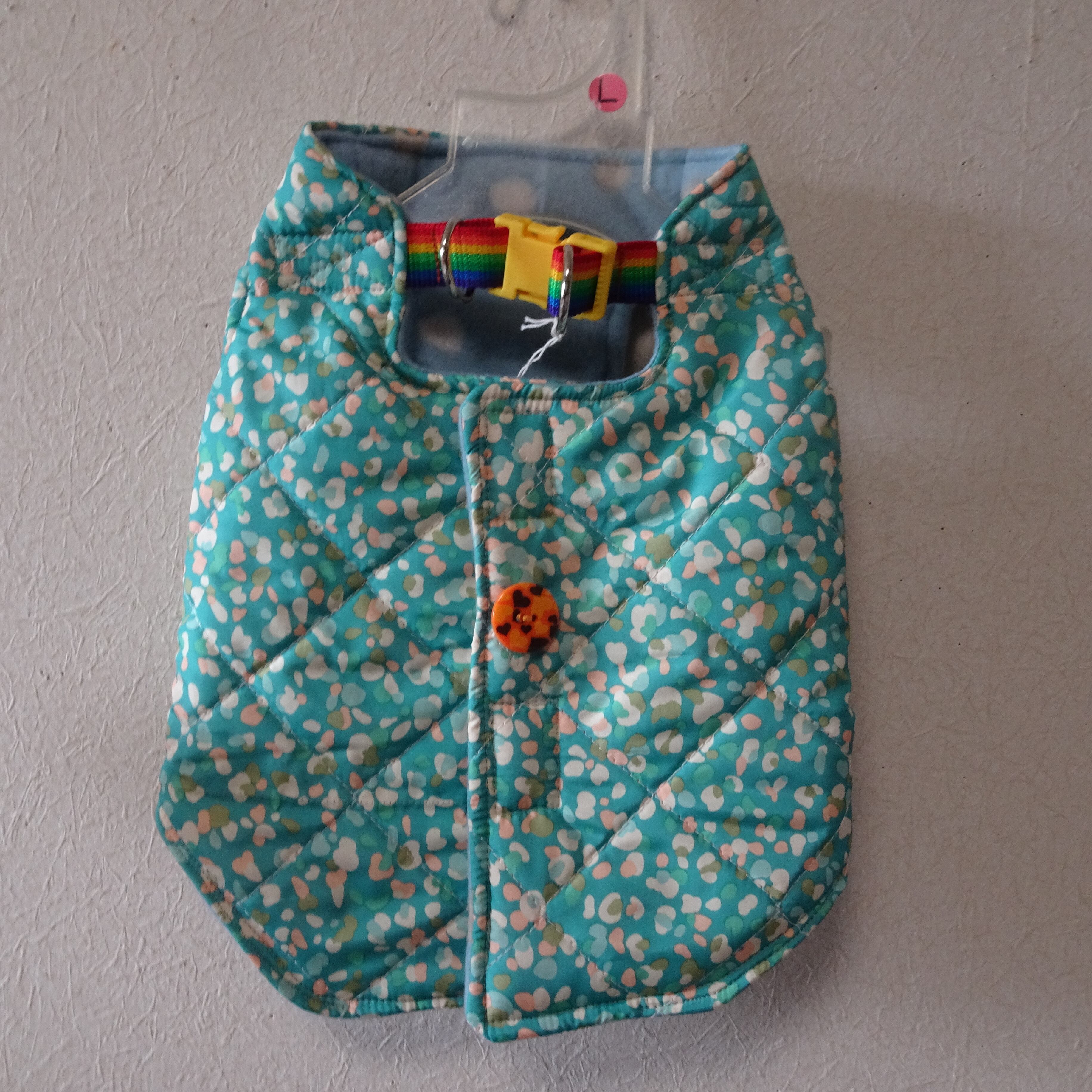 前足を通して、背中で留めるだけの簡単装着で、軽くて暖かです。