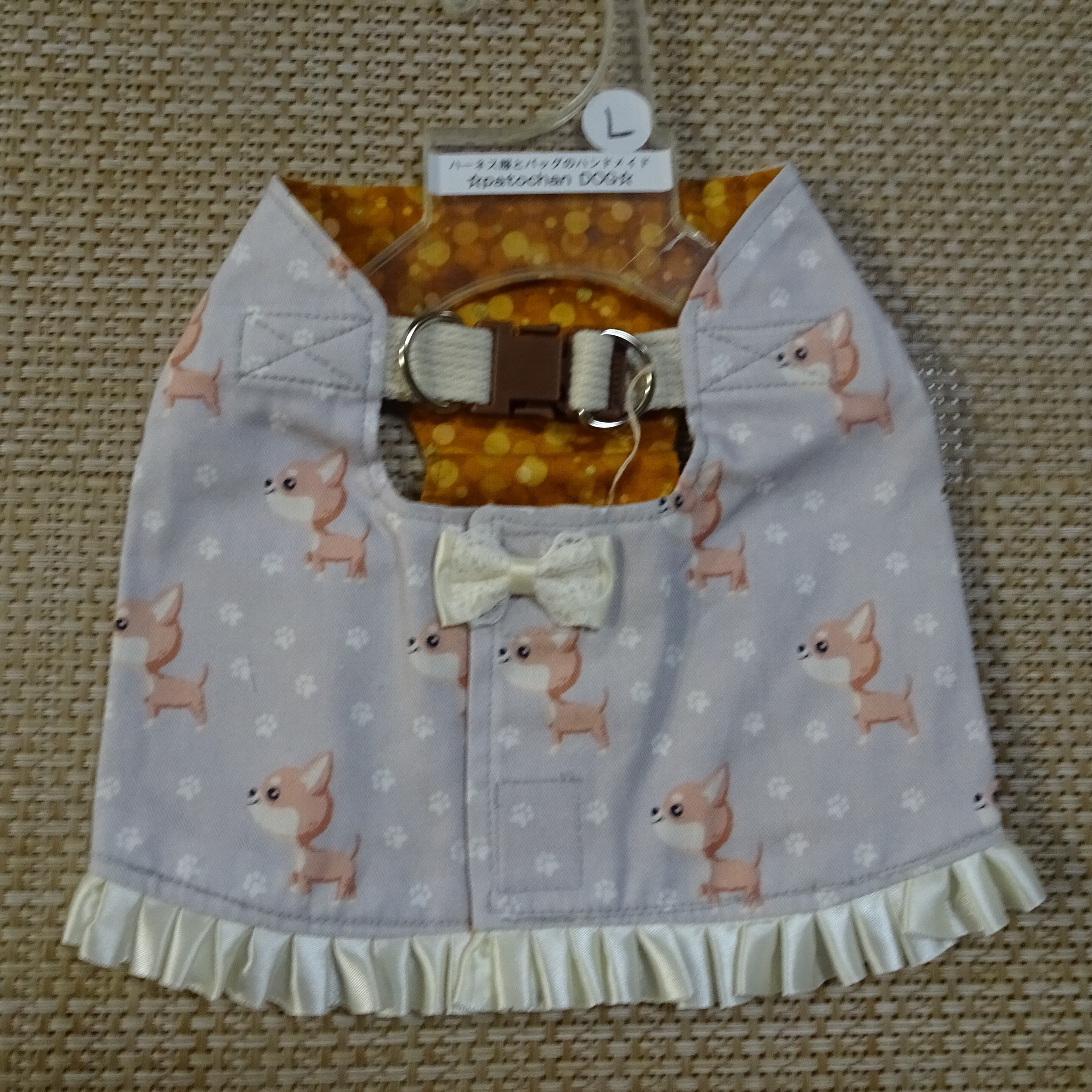 L:チワワ柄・グレー:ショート丈ハーネス服(フリル付)