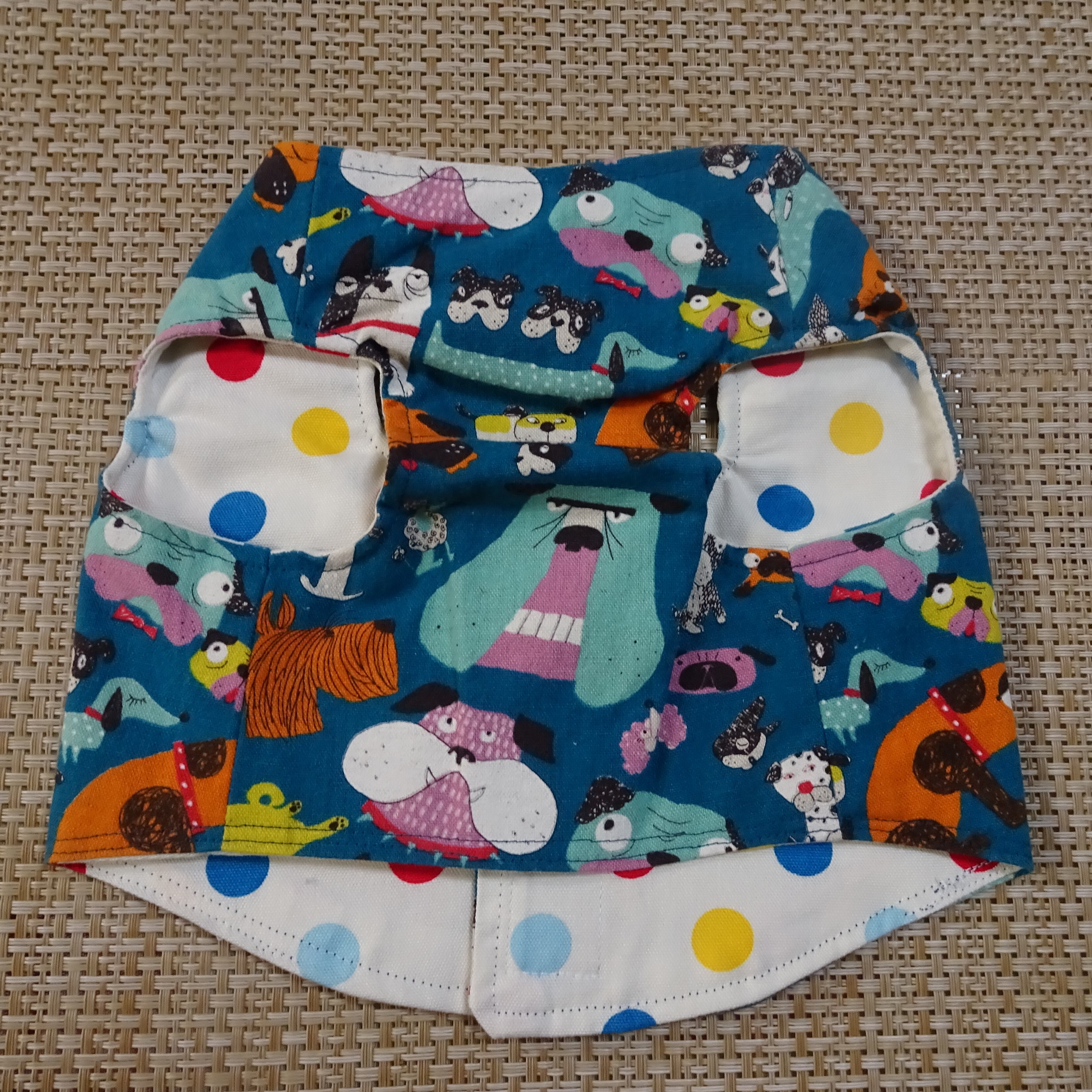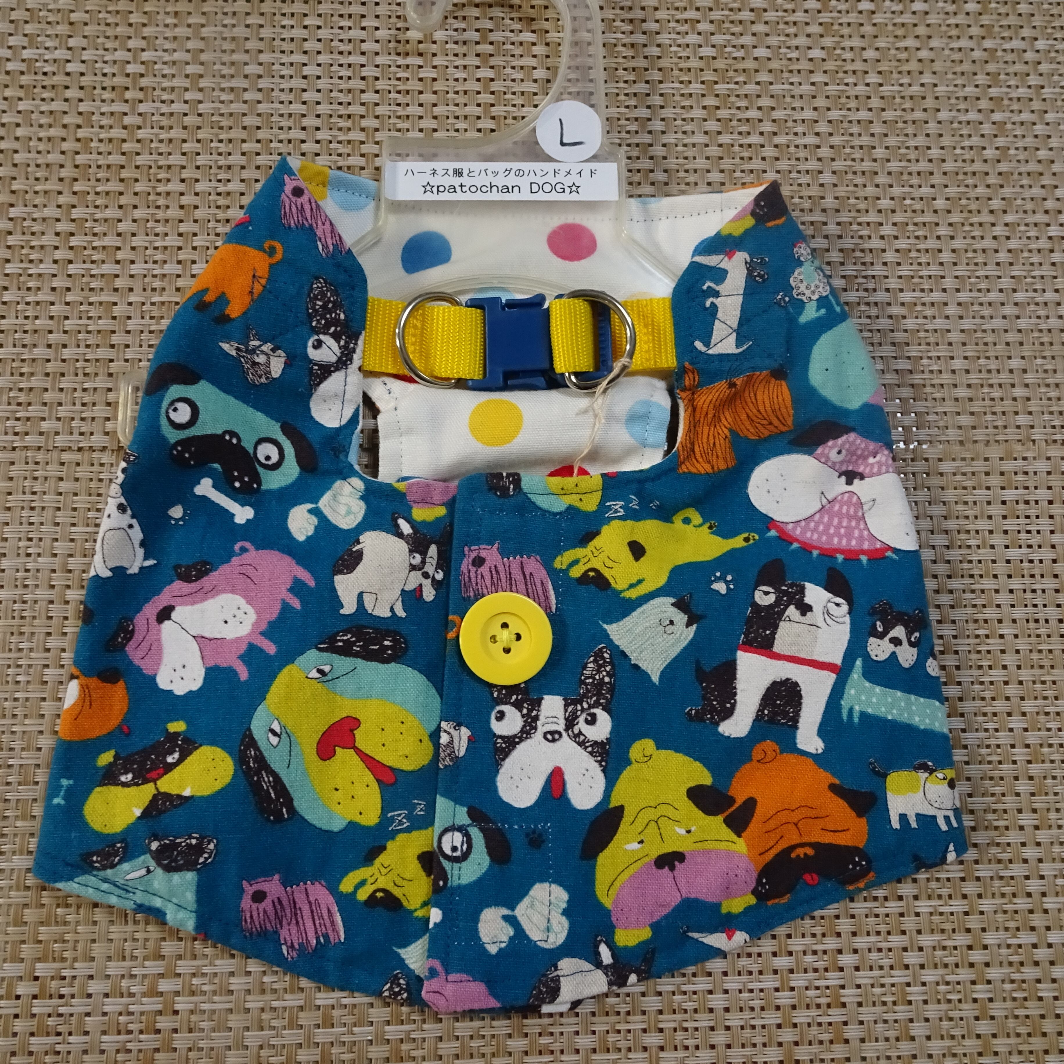 L:鼻ぺちゃわんちゃん柄・ブルー系:ショート丈ハーネス服&バックセット