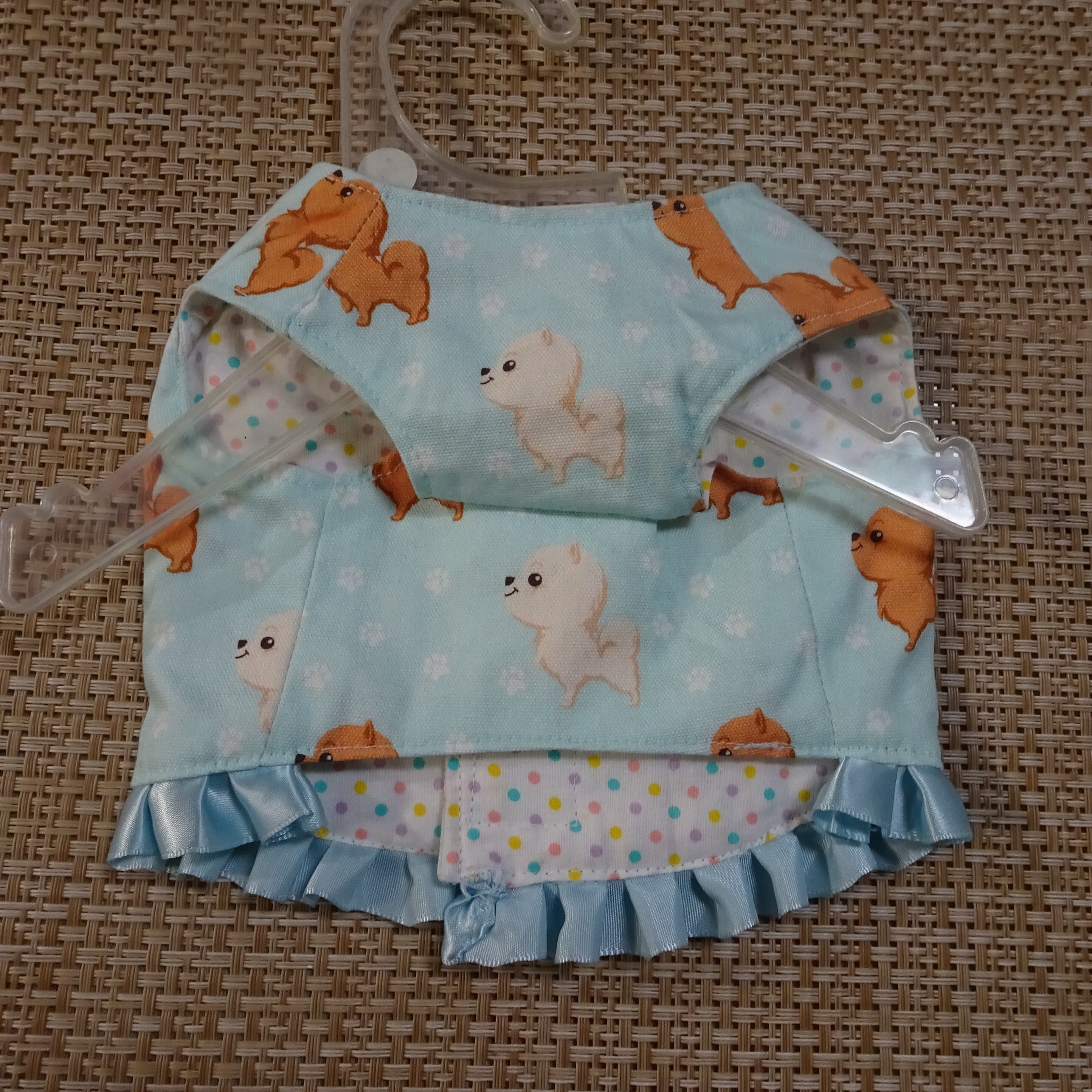 S:ポメラニアン柄・ブルー系:ショート丈ハーネス服&バックセット